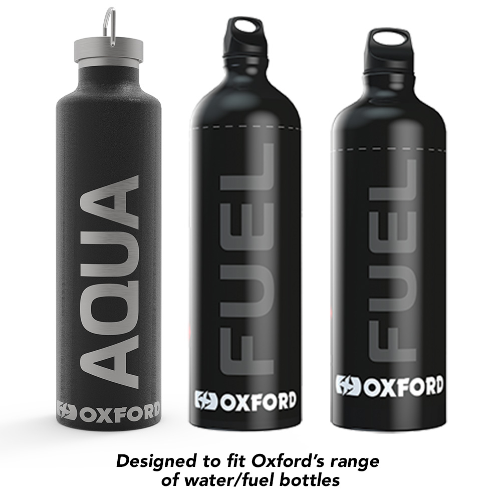 Adjustable drinks and fuel bottle carrier designed to fit Oxford Fuel flask 1.5L & 1.0L and the Oxford Insulated Drinks Bottle 1.0L.