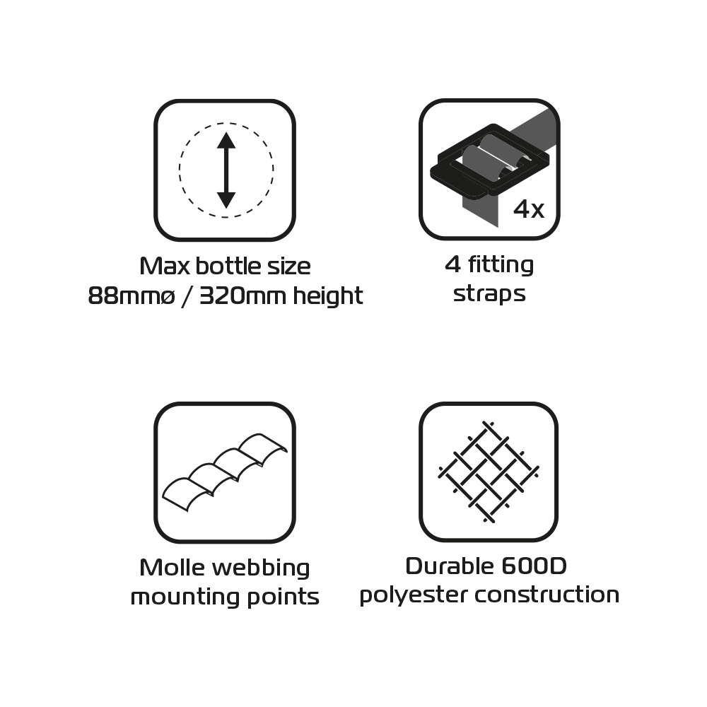 • Adjustable drinks and fuel bottle carrier
